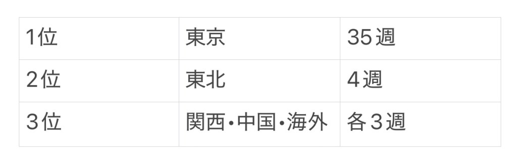 せめて2位の東北4週を来年は8週に出来るよう、何か策を立てたいところ()。
